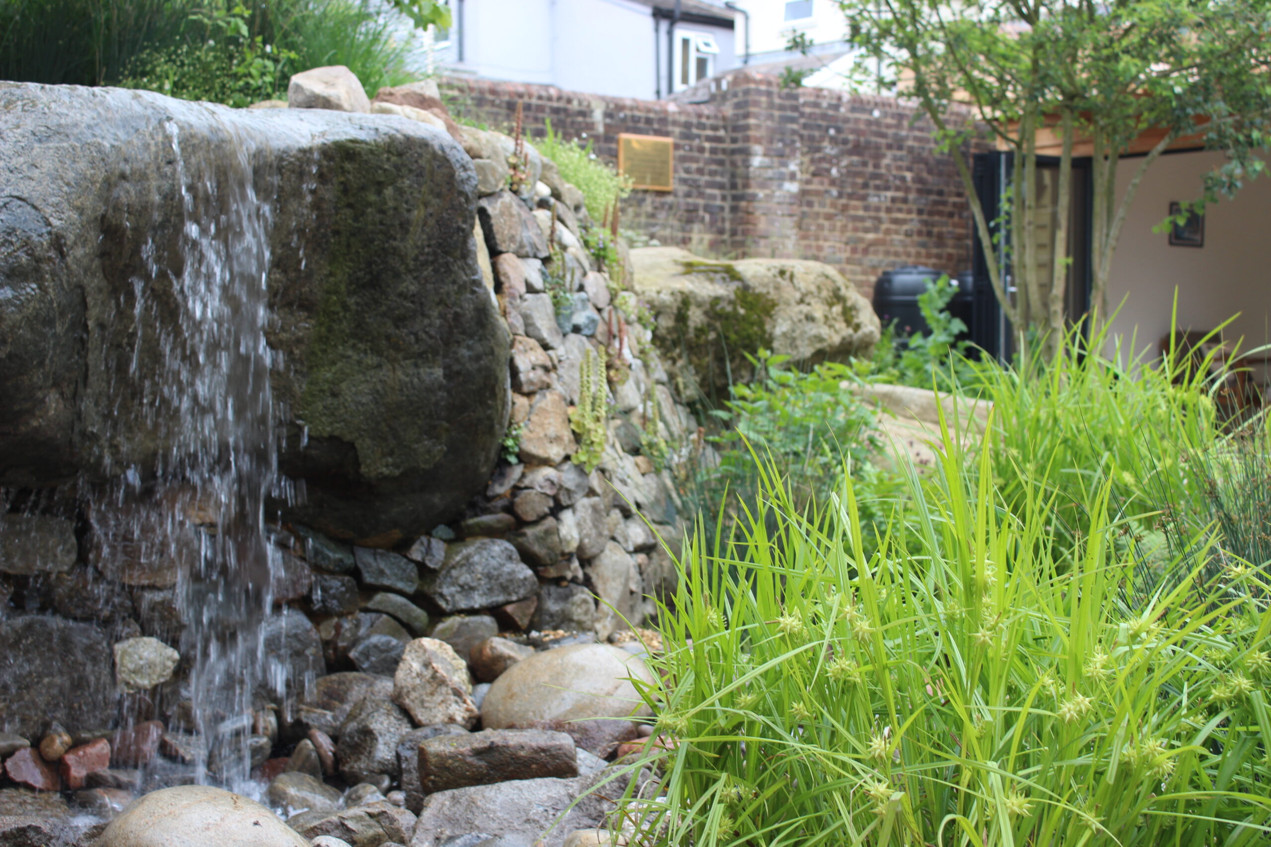 The garden was designed and created by multi award-winning designer Sarah Eberle and it comprises trees and year-round evergreen plants, as well as layered boulders to create an aesthetic structure and a relaxing water feature.